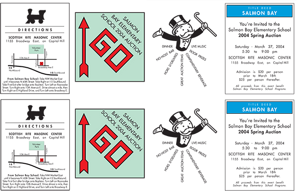 A graphic designer parent is often called to task an auction or two over the school history of her kid. My daughters went to the best K-8 school in the world: Salmon Bay! I thought this was a pretty good idea and implementation of the Monopoly game theme.