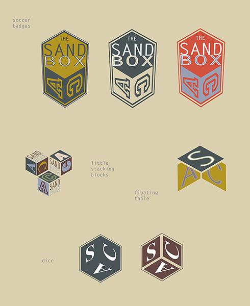 The Sandbox Artist Collective is a collective of Seattle theater professionals who since 2007 have been collaborating, sharing resources, creating new work and supporting each other in the pursuit of making the art of performance in its many forms. They wanted something sporty, like a soccer badge, but I kept having fun finding gaming dice and optical illusions. They use them all in their branding.